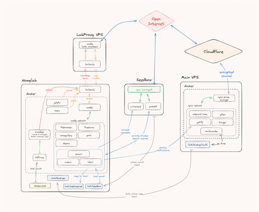 Here’s a map of what I’ve built so far. Right now, I’m mostly done, but surely time will bring more ideas. I’ve also left out a bunch of “technically revelant” connections like DNS resolution through the AdGuard instance, firewalls and CrowdSec on the main VPS.