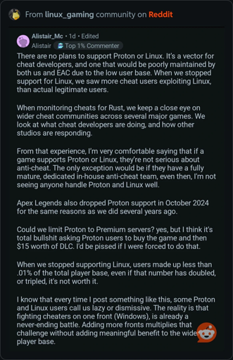 This is so funny because rust has one of the worst cheating situations and majority of their players are windows users, and theres lots of games that have anticheat that allows linux and have notably less significant cheating problems like marvel rivals. in reality rust doesn’t take cheating very seriously because if they did they would have more server side software that detects illegitimate behaviour like tons of other games do successfully… even most popular Minecraft servers have better functioning anti cheat that is completely server side than rust has while getting kernel access to your pc. its pathetic and lazy development tbh and this entire post from them reads like such extreme cope…