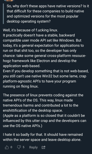 one of the funniest (and sadly accurate) things i’ve heard said about linux backwards-compatibility is that its most stable API is Win32. you can run really old windows software on wine because they support stuff even windows doesn’t anymore.