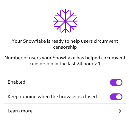 This lets people use your computer as an entry point into the Tor network and camouflage the traffic as a video call between you and them (if the regular, publicly known, entry nodes are blocked by their ISP or gouvernement). The snowflake extension will then forward people’s traffic through the Tor network, and services they use will only see a tor exit node’s IP, not yours. As long as you trust Tor to be secure and anonymous (I personally have very high trust in its guarantees), you don’t have to worry about legal consequences or being blocked by services.