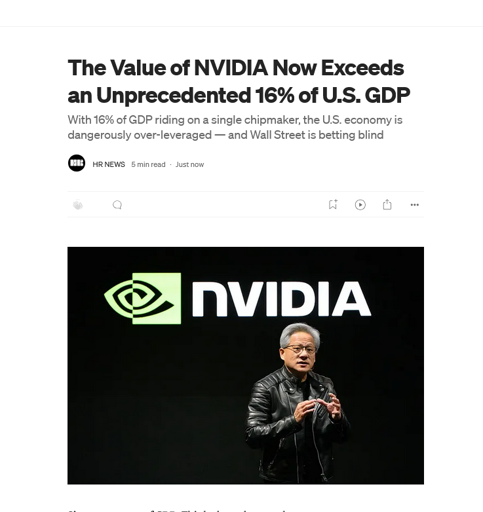 arrow-up11arrow-down1imageThe Value of NVIDIA Now Exceeds an Unprecedented 16% of U.S. GDPplus-squarelemmy.worldtheHRguy@lemmy.world to Technology@lemmy.worldEnglish · 3 months agomessage-square0linkfedilink